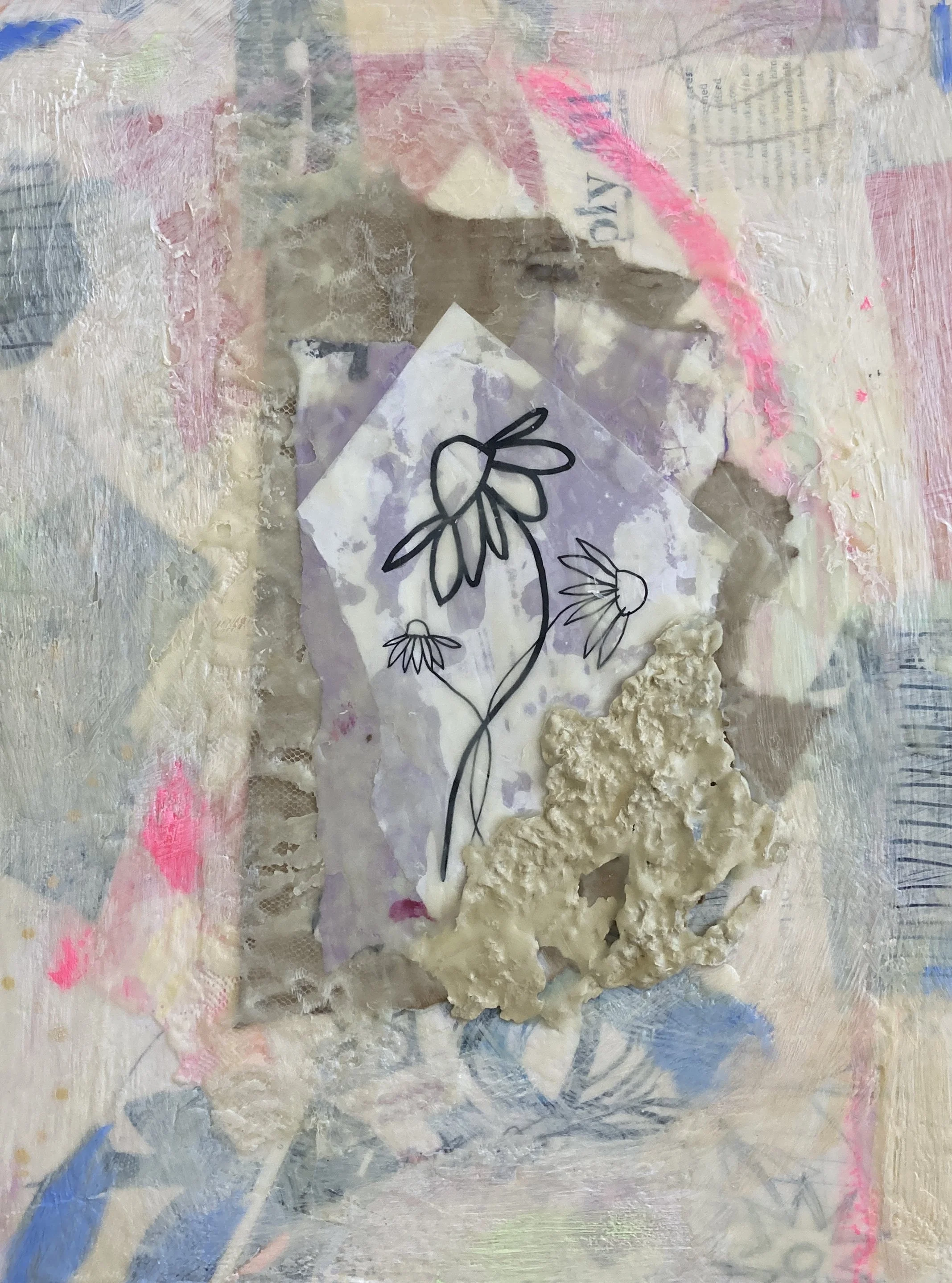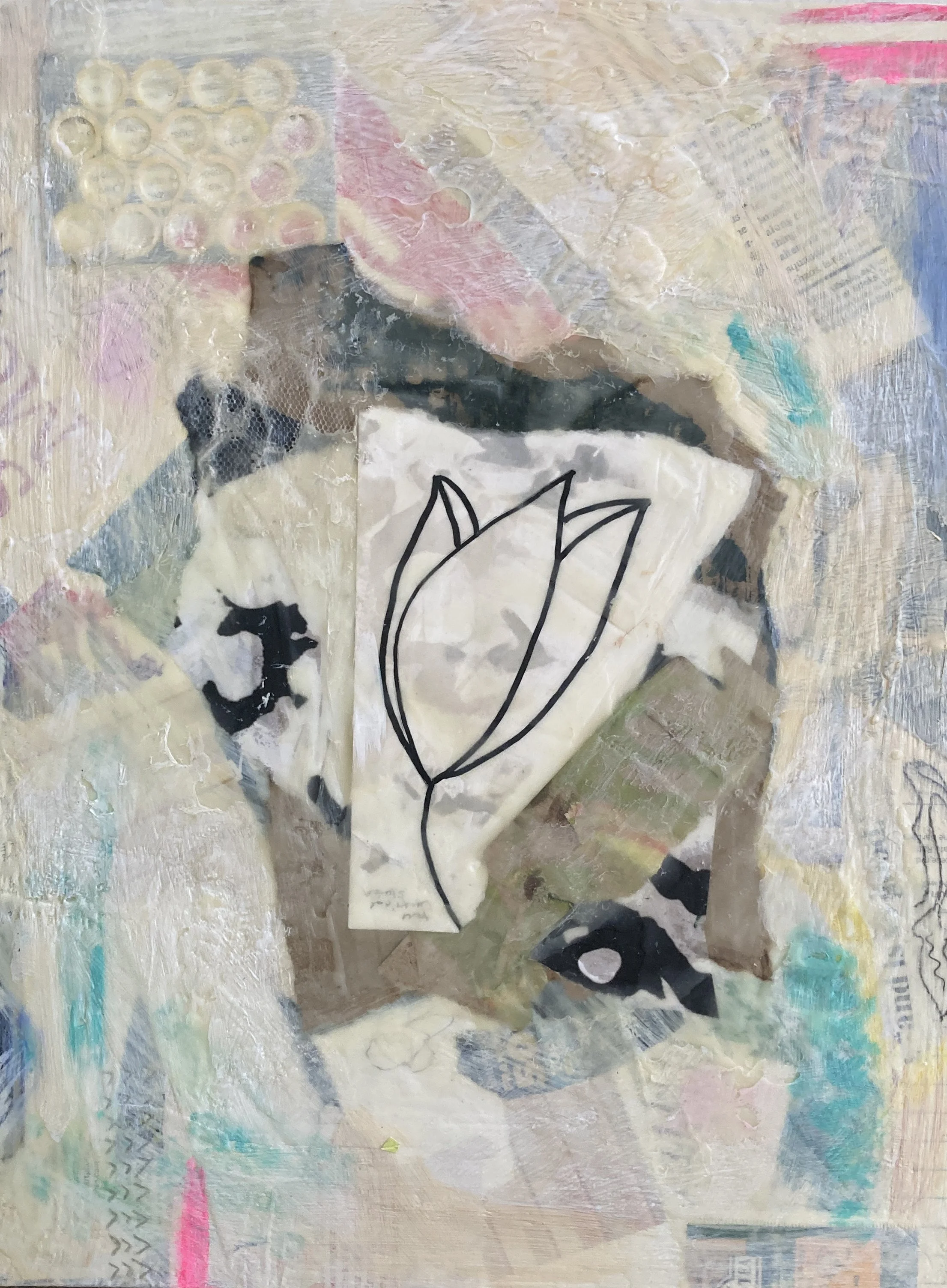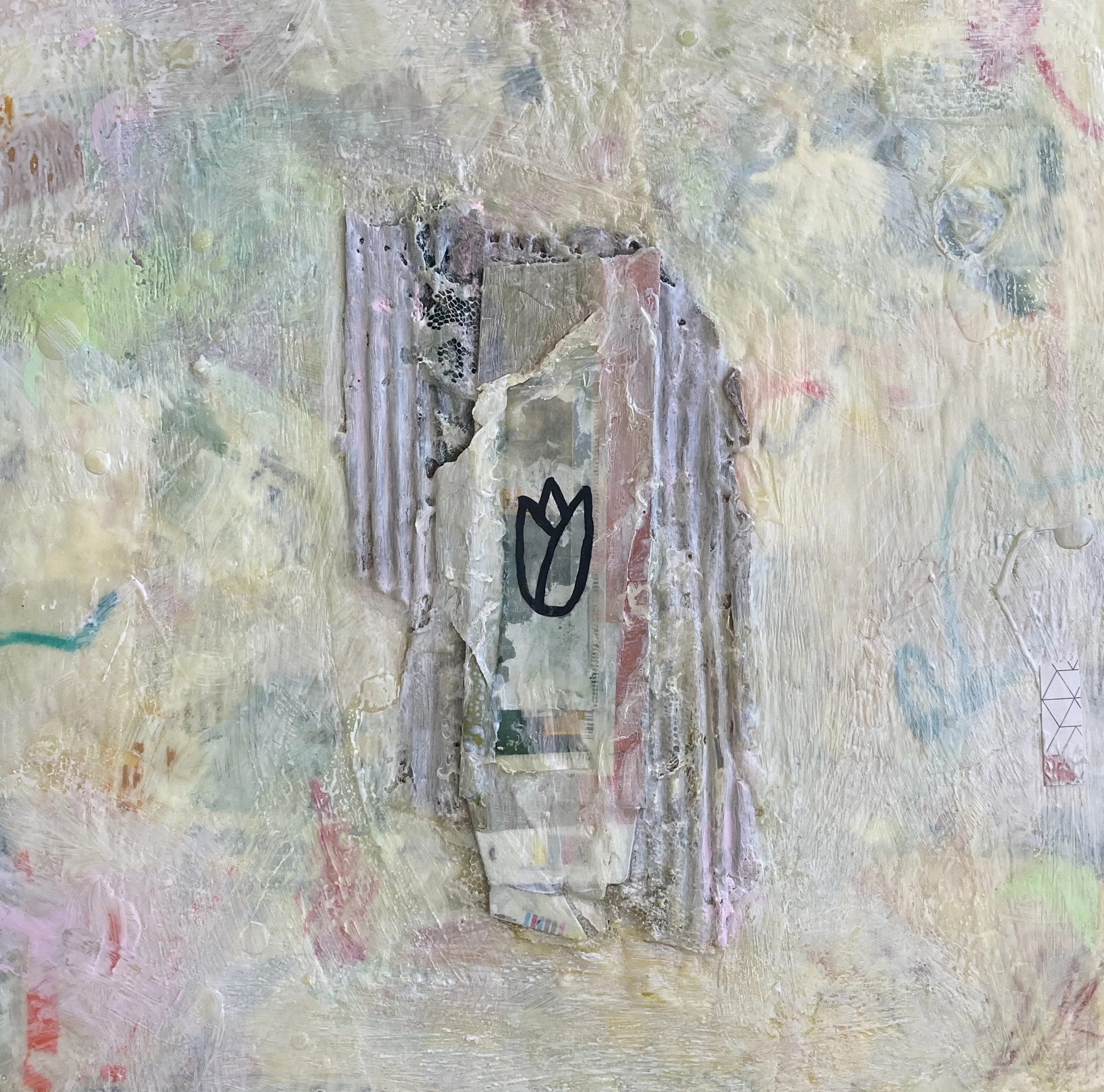 Tiny Tulip / Mixed Media collage, encaustic, oil and acrylic paint, packaging, papers, found materials, cardboard, on wood