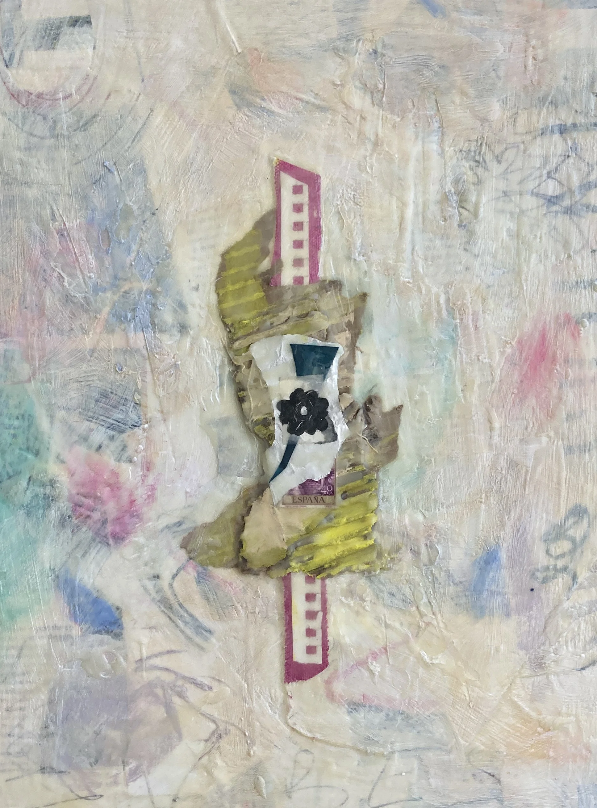 Stages/ Mixed Media collage, encaustic, oil and acrylic paint, paper pulp, papers, found materials, recycled cardboard, on wood