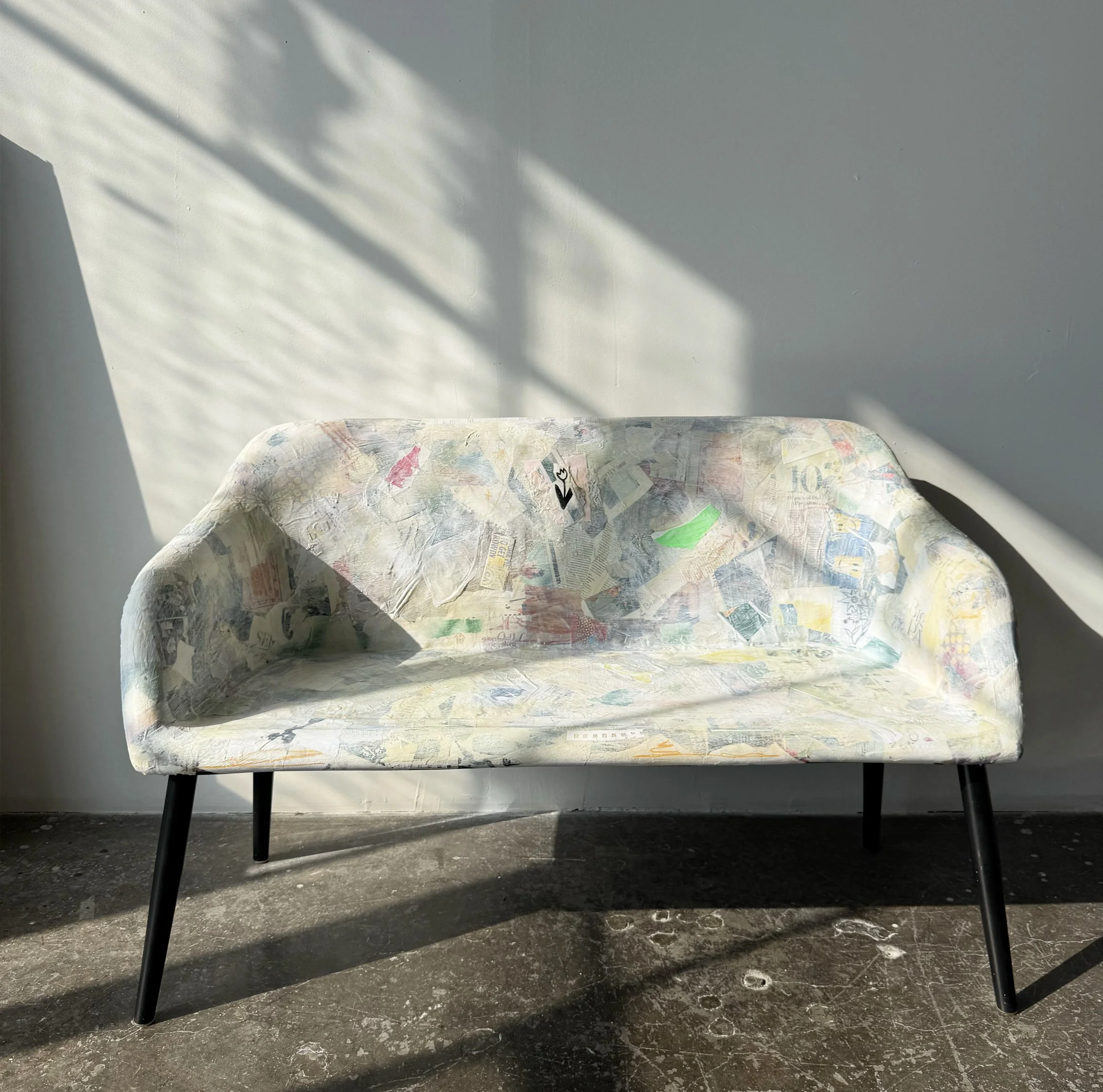 Take A Seat / Mixed Media Repurposed Bench collage and encaustic, journal pages, lace, window screen, magazines, oil and acrylic paint